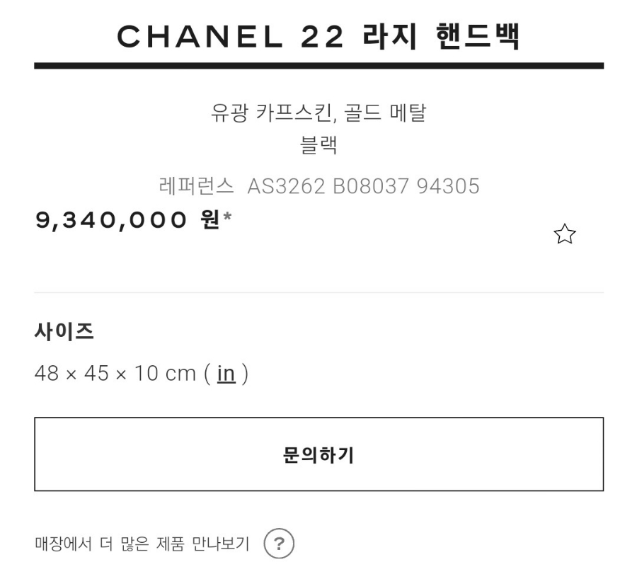 샤넬 22백 핸드백 라지 사이즈(48*45)의 가격은 934만원입니다. 참고로 미니 사이즈(20*19)는 740만원 스몰 사이즈(35*37)는 822만원, 미디엄 미듐 사이즈(39*42)는 867만원입니다. 사실 가죽 요척(한 피스 만드는데 필요한 소요량)을 생각하면 라지 사이즈의 가격은 정말 정말 착한 수준이라고 생각됩니다.