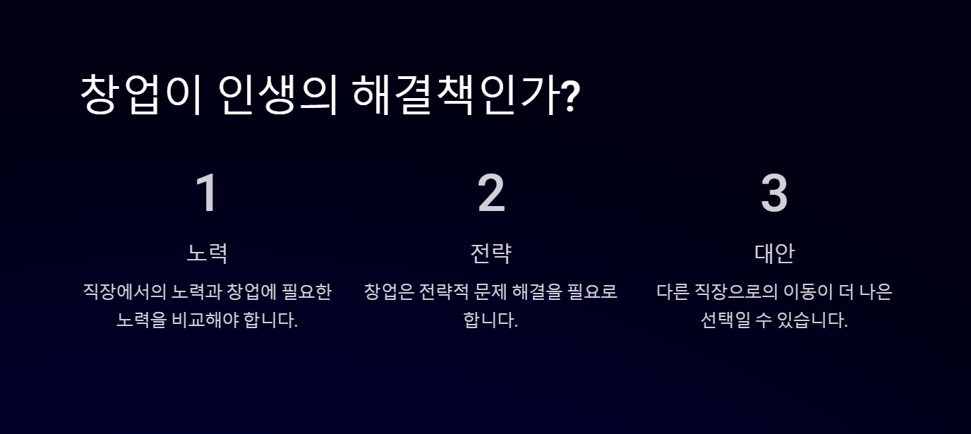 하지만 창업은 내 특성을 파악하고 전략적으로 문제를 해결하는 것이고, 대부분 사람들에게는 이직하는 것이 더 나은 선택이라고 생각해요