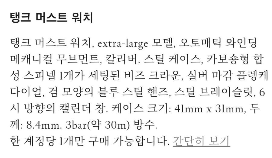 개인적인 실착을 위해서 구매한 시계 중에서는 가장 고가의 제품인 탱크 머스트 엑스라지. 너무나도 원했던 탱크머스트인지라 더욱 더 마음에 쏙 드는 워치입니다. 특히나 스틸에서 느껴지는 고급스러움이 참 마음에 드는 제품입니다.