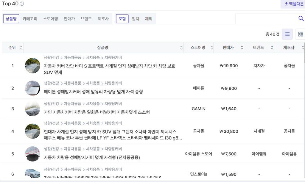 1~40위까지 이미 잘 팔고있는 상품명 확인이 가능합니다 (광고영역은 제외)