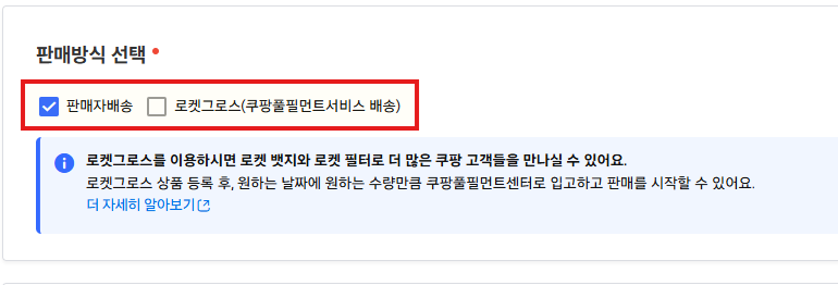 로켓 크로스 등록은 수정이 어렵고 오류도 많기에, 일단 [판매자배송]으로 선택