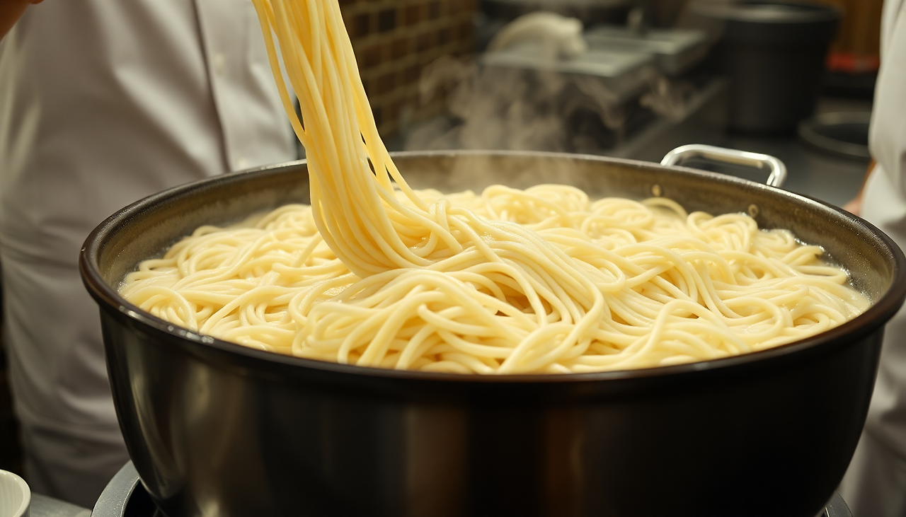 면장인이 되려면 필기시험부터 통과해야 해요. 밀가루 종류와 상태, 그날의 습도와 온도에 따른 소금물 농도까지 다 알아야 하죠. 면을 삶는 타이밍은 물론이고, 반죽을 칠 때 나는 소리, 면을 끌어올리는 모습까지 심사위원들이 본다고 해요. 뽑아낸 면은 둥글둥글하지 않고 네 귀퉁이에 각이 딱 서 있어야 해요. 젓가락으로 집었을 때 면 중앙이 살짝 오목하게 들어가는 '면의 허리'가 있어야만 합격할 수 있답니다.