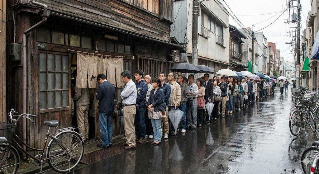 직원들은 반죽하느라 사람들을 쳐다볼 시간도 없어 보였어요. 손님들은 입구에 쌓인 그릇을 들고, 직원이 갓 뽑은 하얀 생면 한 덩이를 그릇 위에 던지듯이 줬어요. 손님들은 직접 뜰채로 면을 데우고, 파나 튀김 같은 고명도 각자 알아서 덜어 먹는 방식이었죠. 심지어 의자가 없어서 서서 먹거나, 그릇을 들고 밖으로 나와 바닥에 앉아서 먹는 사람들도 있었어요. 이 광경을 본 아와타 사장은 몸을 바들바들 떨 정도로 큰 충격을 받았답니다.