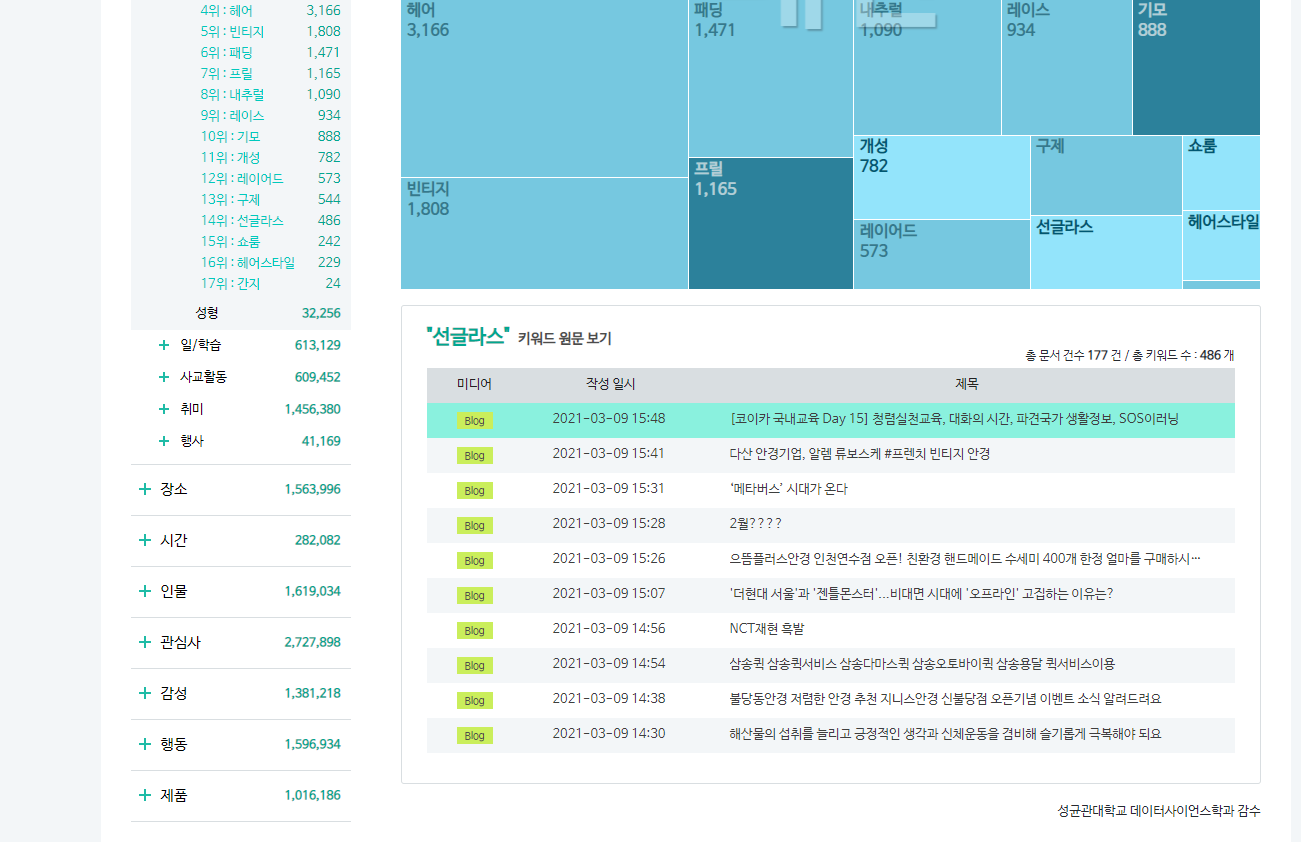 - Social Analysis는 언론, Blog와 SNS 같은 소셜 미디어에서 언급되는 주제별 단어들을 라이프 스타일에 맞춰 측정한 데이터를 제공합니다.