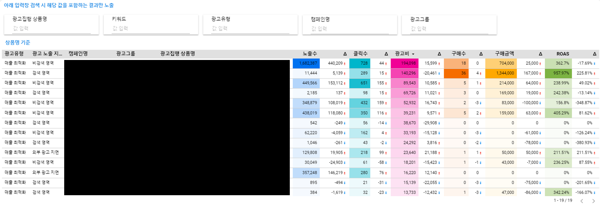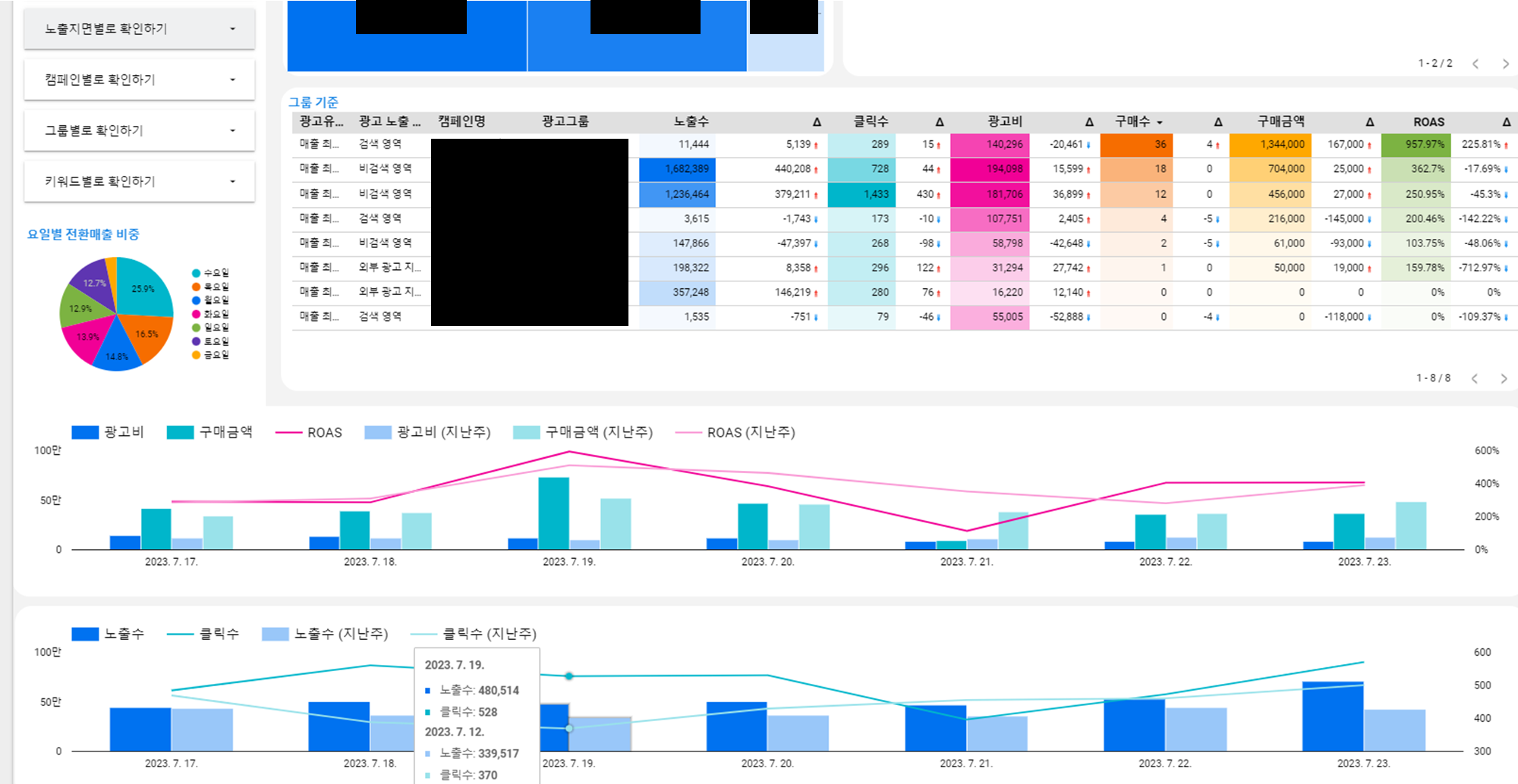 3. 지나주대비 광고효율 비교 (광고비,구매금액,ROAS,노출수,클릭수,전환수 등) → 네이버와 동일